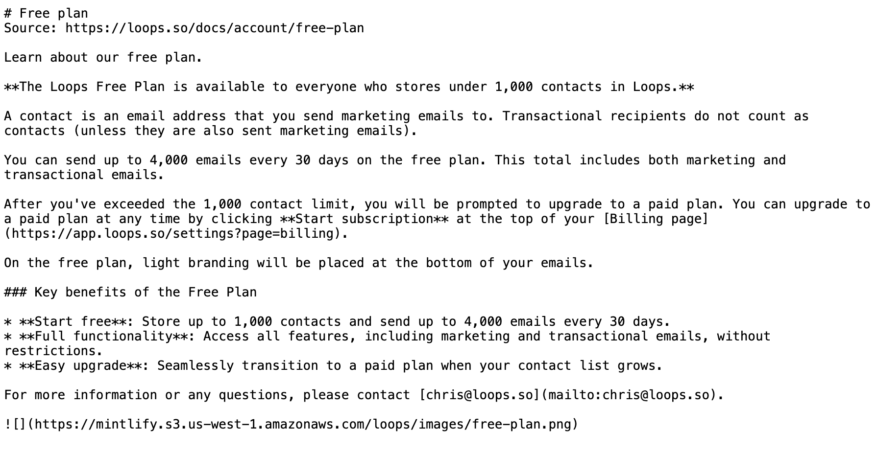 Loops.so’s example [6] demonstrates a more detailed approach, including full documentation content with headers, step-by-step instructions, and even embedded images in its llms-full.txt file.
